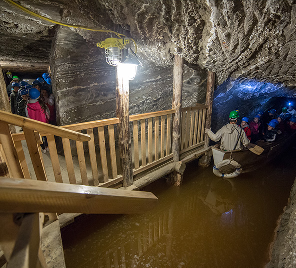 For those not afraid of speed, a 140 meter (460 ft) wooden ramp is waiting to slide down between the mine levels. Finally, take a boat trip across a chamber filled with brine, an unforgettable experience and definitely the biggest attraction of the mine. The mine offer includes overnight stays and it also works as a health resort.